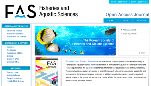 Fisheries and Aquatic Sciences is an international scientific journal of the Korean Society of Fisheries and Aquatic Science, and it was renamed in 2009 after the Journal of Fisheries Science and Technology to reflect the expanded importance of fisheries and aquatic sciences for the 21st century. The journal publishes papers on applied or scientific research relevant to aquaculture, aquatic life and environments, fisheries and seafood sciences. In addition to publishing papers reporting results of original research, the journal will also include, review articles, technical papers, short communications, research notes and book reviews.