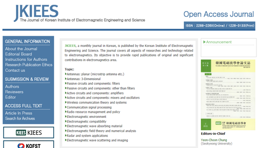 JKIEES (The Journal of Korean Institute of Electromagnetic Engineering and Science) was launched in 1996 and has been published Monthly by the Korean Institute of Electromagnetic Engineering and Science. It was selected as a candidate journal to be registered with National Research Foundation of Korea and finally registered with the Foundation in 2004. For a period of 16 years, about 2,300 excellent papers have been published by our journal. JKIEES has posted papers largely on profound research of antennas, microwave engineering, EMI/EMC, and applied electromagnetics. Its fields of contributed paper also have been expanded into diverse areas such as wireless communication systems, spectrum engineering, RF systems, electromagnetic materials, radar and radio application, and electromagnetic scattering and imaging.