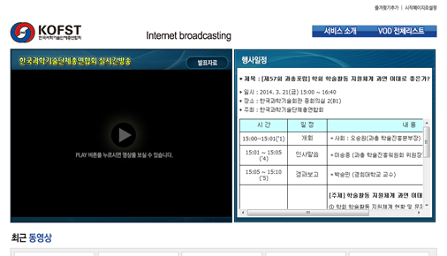 이에 과총은 개최 및 주관하는 포럼과 세미나, 컨퍼런스 등을 과학기술인 단체 및 일반인들이 보다 쉽고 빠르게 공유할 수 있도록 인터넷 모바일 실시간 방송과 VOD 다시보기 서비스를 제공 합니다.