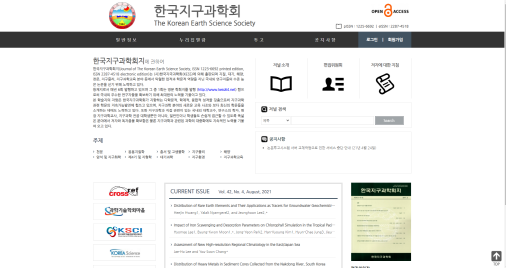 한국지구과학회지(Journal of The Korean Earth Science Society, ISSN 1225-6692 printed edition, ISSN 2287-4518 electronic edition)는 (사)한국지국과학회(KESS)에 의해 출판되며 지질, 대기, 해양, 천문, 지구물리, 지구과학교육 분야 등에서 탁월한 업적과 학문적 역량을 지닌 국내외 연구자들의 수준 높은 논문을 싣기 위해 노력하고 있다. 등재지로서 매년 6회 발행하고 있으며 그 중 1회는 영문 학회지를 발행 (http://www.kess64.net) 함으로써 국내외 우수한 연구자들을 확보하기 위해 최대한의 노력을 기울이고 있다. 본 학술지의 자랑은 한국지구과학회가 지향하는 다학문적, 학제적, 융합적 성격을 갖춤으로써 지구과학 관련 학문의 지속가능발전에 힘쓰고 있으며, 지구과학 분야의 새로운 교육 사조와 보다 최신의 학문들을 소개하는 데에도 노력하고 있다. 또한 지구과학과 직접 관련이 있는 국내외 대학교수, 연구소의 학자, 현장 지구과학교사, 지구과학 전공 대학생뿐만 아니라, 일반인이나 학생들도 손쉽게 접근할 수 있도록 폭넓은 분야에서 저자와 독자층을 확보함은 물론 지구과학과 관련된 과학의 대중화에도 지속적인 노력을 기울여 오고 있다.